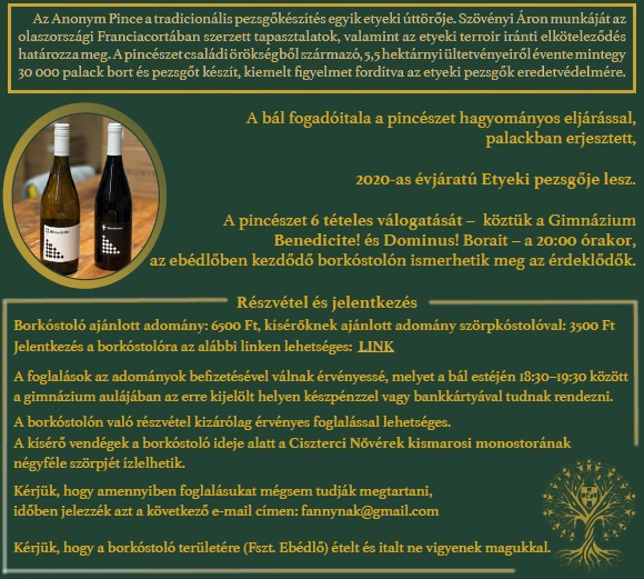 20.00–21.45 Borkóstoló: Anonym Pincészet, Etyek (előzetes regisztrációval)