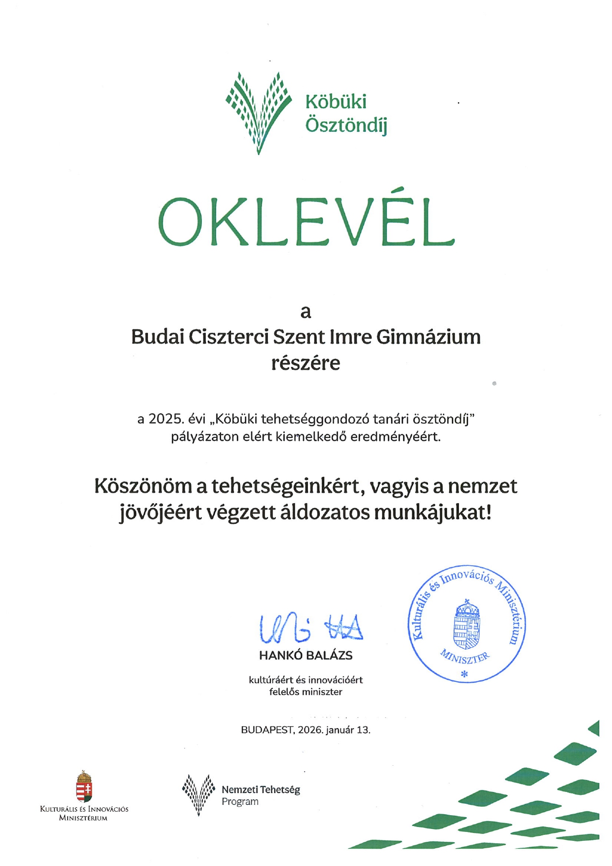 Gimnáziumunkba látogatott Csaba Gábor a Kulturális és Innovációs Minisztérium, kulturális diplomáciáért felelős helyettes államtitkára, hogy átadja a "Köbüki tehetséggondozó tanári ösztöndíj" elismerő oklevelet.